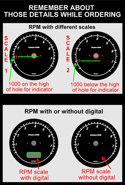 - Оборотомер: 6000 оборота, 7000 обор. scsle 1 от схемата, 7000 обор. scsle 2 от схемата, часовник.