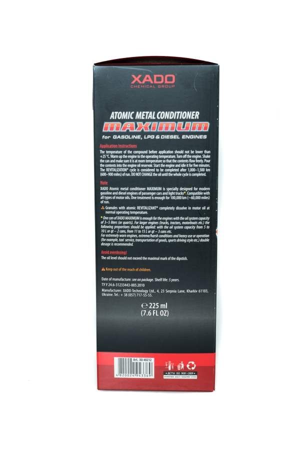 - XADO MAXIMUM е съвместим със всички типове масла, така и за бензинови и дизелови автомобили.